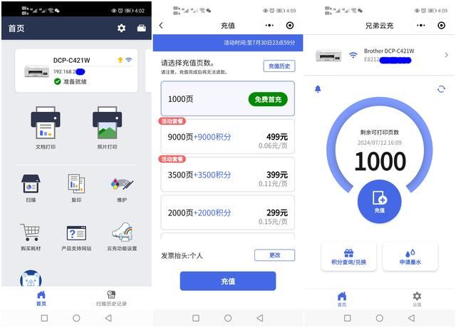这个打印机的一个特点,就是按需打印,按页付费,墨水耗材免费的新颖计量模式。按照指引,安装app,绑定无线打印机之后,新用户会获得厂家会贴心的免费赠送的1000张打印量。当赠送的打印量用完之后,用户可以通过小程序充值之后,继续进行打印了。这个新推出的打印机使用模式,算上充值打印量赠送的积分再兑换打印量下来,打印一张纸最低能做到0.05元左右,墨水成本是由厂家免费提供,不需要额外的费用了。