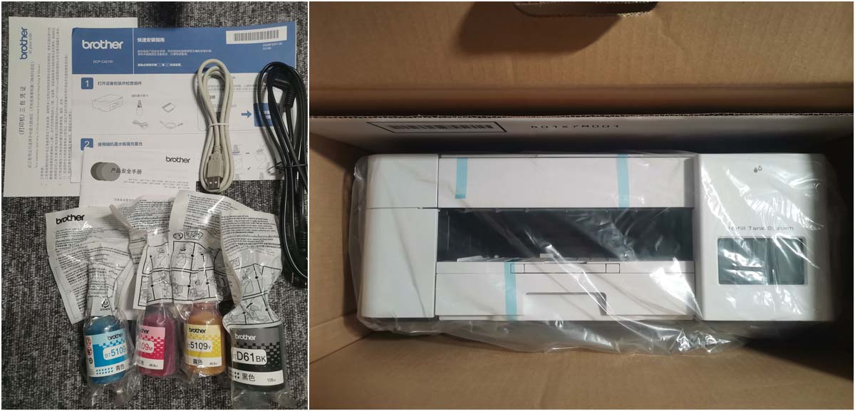 打印机到手后先来一个全家福。除了打印机本身,附带了电源线,数据线(这个其实用不上,因为机器用无线传输,所以随便放到家里有网络的地方就行了,我就把它放在我孩子的书桌稍微远一点旁边,方便取件)和CMYK四色的墨水。