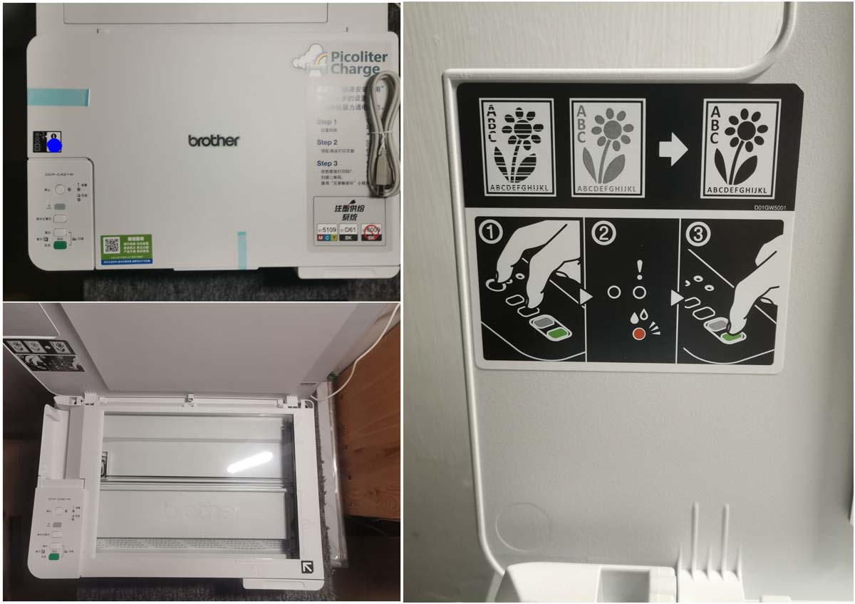 打印机的设计十分简约,上半部分是扫描仪部分,掀开就是放置稿件的地方,也贴了说明教大家怎么设置复印和打印的质量,左边是控制面板,右边正面是墨水仓库,整体设计非常的有条理。控制面板有复印键,连手机都不用,直接有稿件就能按需求选择复印黑白还是菜色,而身份证复印模式,能非常简单方便的在同一张纸上复印出正反面,对用户来说,复印功能是非常的简单方便。而且扫描仪分辨率能达到1200×1800dpi,能让复印出来的稿件达到非常的细腻的效果。