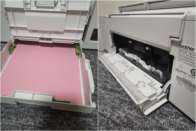 加注好墨水之后,在纸夹加入纸张,纸夹容量大约是150张纸(这个在其他品牌机器上面,估计要上千元左右的机器才会有纸盒设计,能有效减少加纸频率,防潮防尘,从中也能看出来兄弟C421W打印机的高性价比),足够普通家庭平常使用了。作为一个多年的打印机维修人员,也深知很多时候打印机卡纸,是进纸的搓纸轮老化,在进纸的时候卡住,而兄弟打印机在对应这个问题,也是非常的贴心,除了使用进纸盒来降低卡纸风险之外,在打印机的后方进纸搓纸轮的位置设置了可以打开的后盖,确实发生卡纸的时候,用户处理起来就很方便了。对比其他品牌打印机,其实非常的贴心设计。