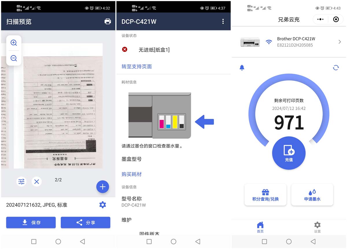 之后说一下其他功能,打印机的扫描功能也是非常的简单易用,扫描之后,图像会通过app或者电脑驱动,保存在机器里面,可供查阅,也能按照需求在适当的时候打印出来,打印分辨率高达1200×6000dpi,效果是非常的细腻,彩色打印也能在很多地方派上用场。而且通过app可以实时看到打印机墨水的容量和打印剩余量情况,让用户随时了解动态,在适当的时候免费申请墨水。