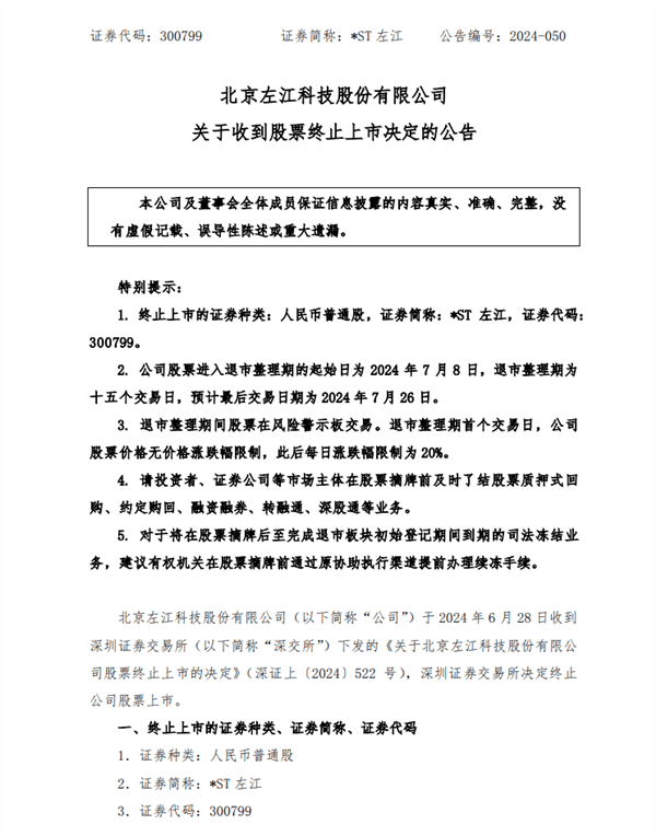 6月28日,深交所下发终止上市决定,左江科技自7月8日进入退市整理期,直至7月26日最后一个交易日后被摘牌。