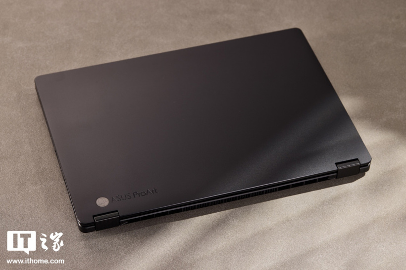 ProArt 创 13 2024 为全金属材质机身,纳米科技黑配色配合精密的喷砂工艺让机器的金属质感非常强烈,同时线条硬朗简洁,极具设计感。A 面左下角采用银白色 ProArt 铭牌 + 印刻 ASUS ProArt 字母 LOGO 进行点缀,十分精致。