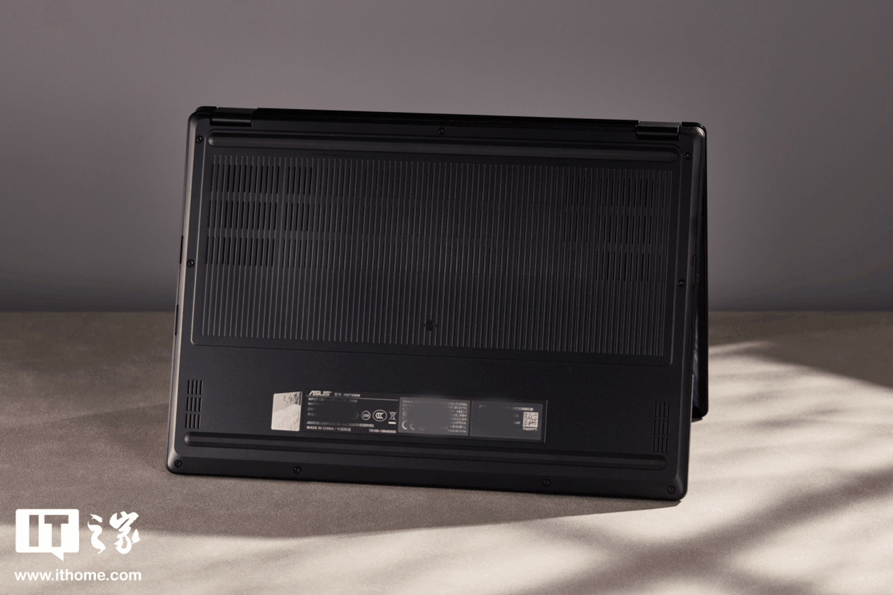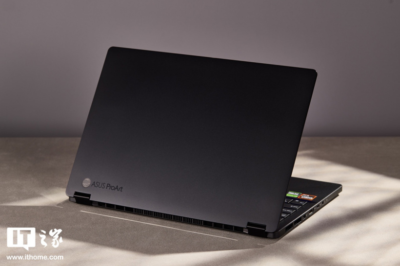 ProArt 创 13 2024 的 D 壳三分之二面积都覆盖了规整的进气口,上下两条长脚垫,下方脚垫左右边缘处各有一个扬声器开口,四周边缘做了斜切倒角处理。