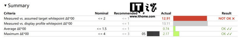 切换到更适合影视创作的 DCI-P3 色域模式,此时平均 Delta E 为 0.74,最大 Delta E 为 2.17。因为该模式下的白点值为 63,并不是常见的 65,所以目标白点偏离略大,不过色准的表现还是不错的。
