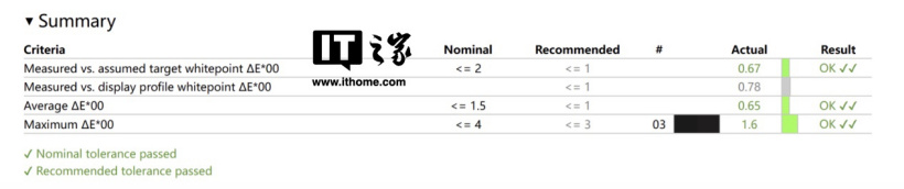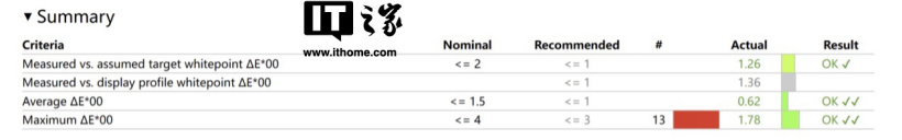 随后是更适合摄影师后期的 Display P3 色域模式,平均 Delta E 为 0.65,最大 Delta E 为 1.60。色彩显示同样精准,