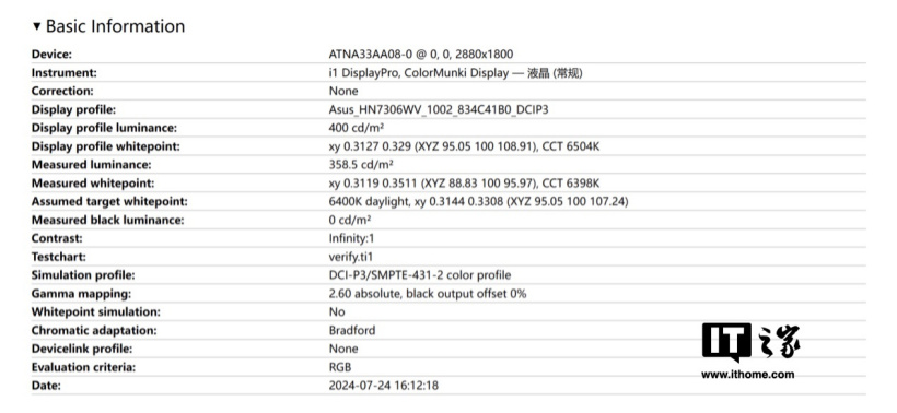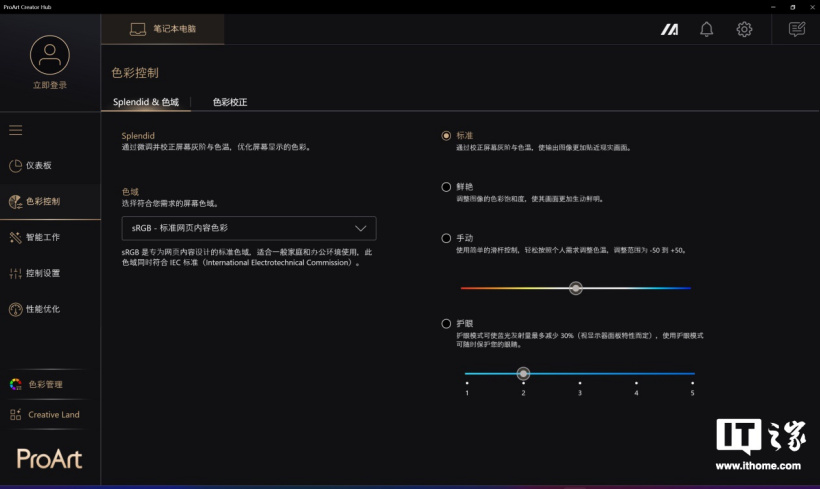 本站也对这块屏幕的素质进行了测试,首先要说明的是 ProArt 创 13 2024 内置了一款创作辅助软件 ProArt Creator Hub(创作者中心),自带四种专业色域切换和色彩校正功能。电脑默认采用原生色域模式,也支持切换到 sRGB、DCI-P3 以及 Display P3 专业创作色域,右侧还可以选择饱和度风格,色温调节和护眼等选项。而 ProArt 创 13 2024 的色彩矫正则是支持 i1DisPlay 校色仪,能微调矫正屏幕的灰阶与色温,做到更精准的显色。