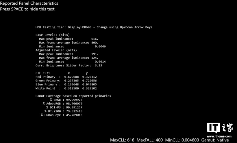 在 Windows 11 系统设置中开启 HDR 模式后,通过 VESA DisplayHDR Test 工具实测,屏幕的峰值亮度则变成了 616nit,在观看 HDR 图片、视频时可以获得更加出色的画面表现力。
