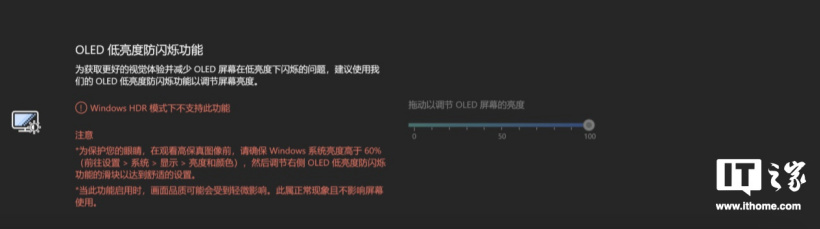 OLED 低亮度防闪烁功能,可以通过专有的屏幕亮度调节,解决屏幕闪烁对用户眼睛的刺激,不过需要注意的是该功能并不支持 HDR 模式下使用,并且在低亮度下可能会略微有些色偏。