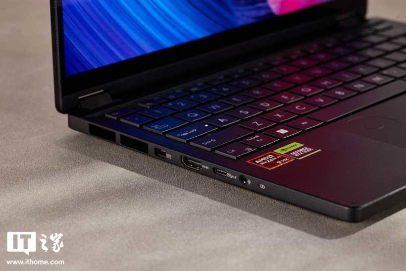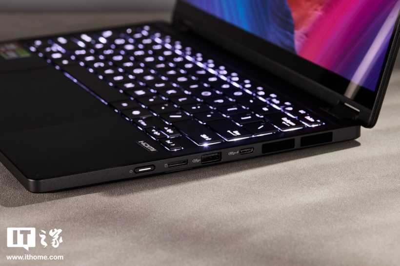 ProArt 创 13 2024 的机身左侧依次排布了一组散热出风口,一个方形电源专属接口,HDMI2.1 接口,USB4 协议全功能 Type-C 接口,3.5mm 音频接口以及状态指示灯。