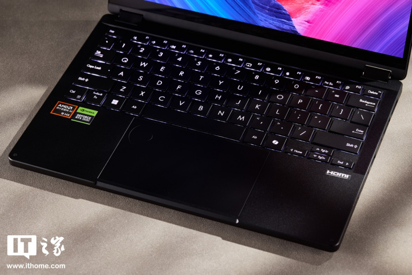 ProArt 创 13 2024 的 C 面采用白色背光设计的方形键帽键盘,键帽方正平整,字体纤细轻盈,有很强的时尚感。按键背光均匀,有三档亮度可调。按键敲击键程适中,回弹清脆,码字体验较好。