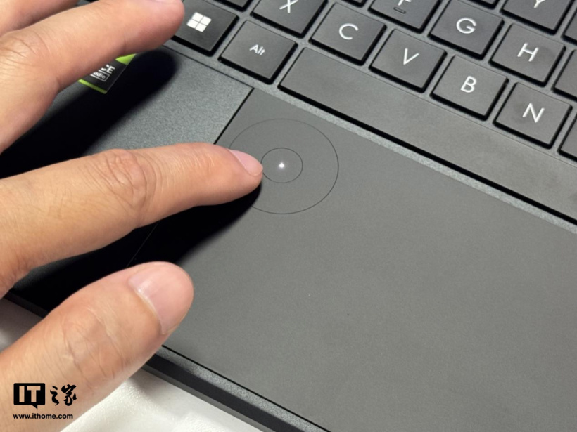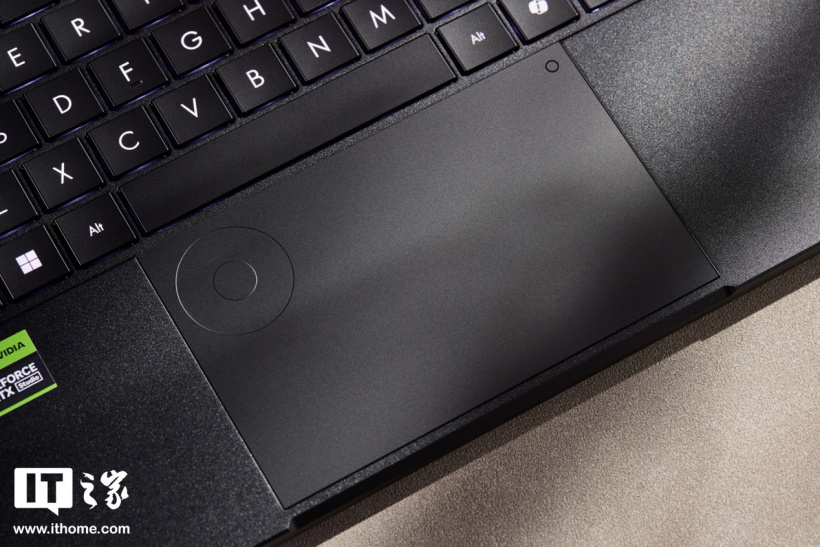 C 面键盘上方和腕托部分都做了特殊涂层处理,手感细腻抗污防尘。触控板部分的面积非常大,上下边缘直接顶到了键盘和 C 面边缘。触控板采用光滑的玻璃材质,并且这次华硕将一代的实体旋钮改成了虚拟旋钮,集成在触控板区域。