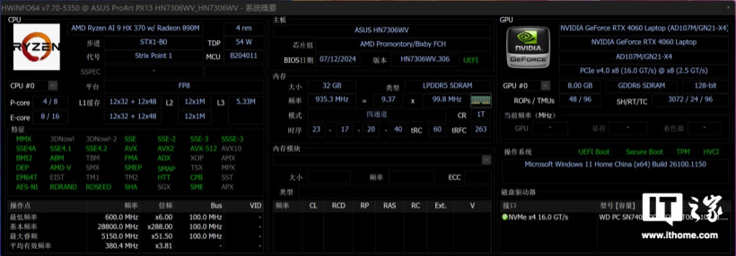 ProArt 创 13 2024 这次首发搭载了 AMD 最新一代 Ryzen AI 9 HX 370 处理器,它隶属于 Strix Point 系列,拥有 12 核心 24 线程,最高加速频率可达 5.1GHz,支持 36MB 缓存(L2+L3 缓存)。相比较上一代旗舰产品 Ryzen 9 8945HS,Ryzen AI 9 HX 370 处理器的内核 / 线程数增加了 50%,计算单元增加了 33.3%,NPU 性能提高了 3.12 倍,算力可达 50TOPS。