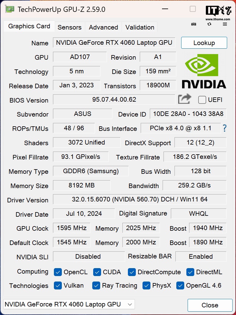 显卡方面,ProArt 创 13 2024 最高可选配 RTX 4060 显卡,其采用 Ada Lovelace 加工,台积电 5nm 工艺打造,拥有 3072 个流处理器,支持第三代 RT Cores 的 DLSS 3.5 技术可让光追性能提升 2 倍,第四代 Tensor Cores 新增 FP8 引擎,DLSS 至多提升 4 倍性能。华硕默认为其安装了 Studio 版本驱动,不仅更为精简,在生产力软件的表现上也要更加出色。