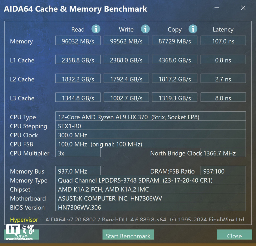 本站实测读写速度均接近 100GB/s,延迟为 107.0ns,L3 缓存延迟为 8.0ns,性能较为出色。