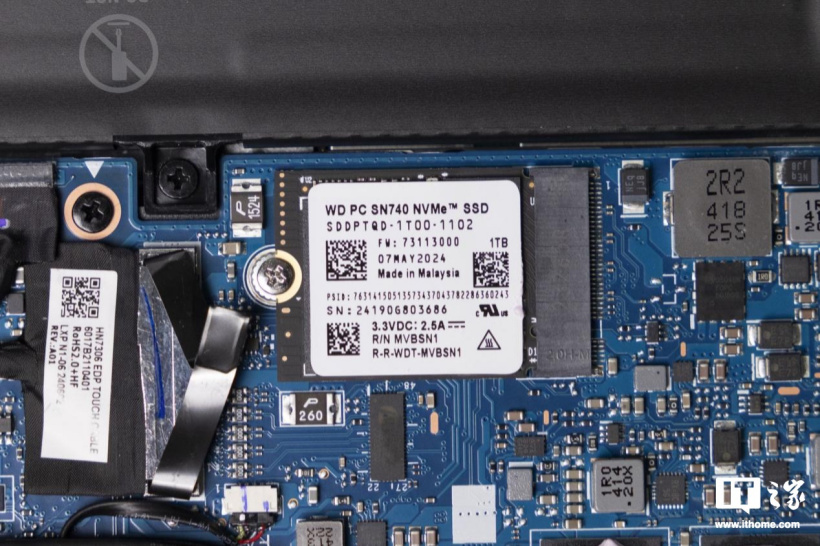 ProArt 创 13 2024 内置硬盘为西数的 SN740,NVMe PCIe 4.0 协议,容量为 1TB。由于空间比较紧凑,只能安装 M.2 2230 规格的固态硬盘。并且,ProArt 创 13 2024 也没有其他空余的硬盘位供后续升级。