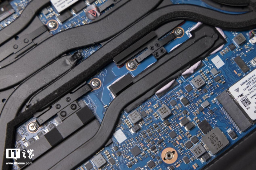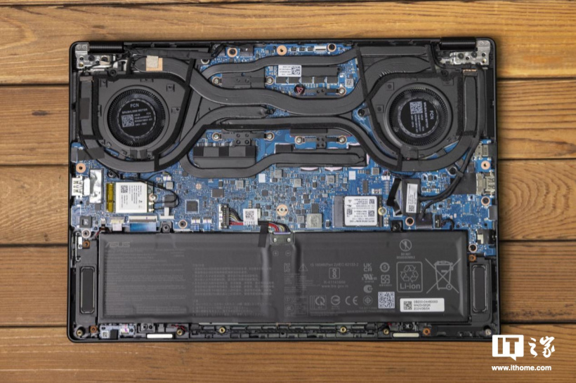 按照惯例,性能测试前我们先拆机看看它的内部散热设计。ProArt 创 13 2024 采用了 10 颗梅花螺丝固定,两侧的浅槽利于撬开 D 壳,打开后可见内部的空间利用率还是很高的。ProArt 创 13 2024 采用四热管双风扇四出风口设计,其中有一条热管也能为显存与内存散热。