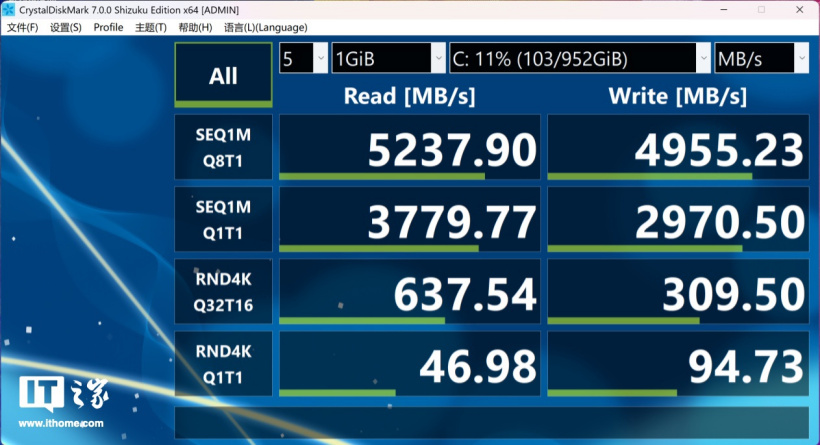 本站使用 CrystalDiskMark 为其做了性能测试,其顺序读取速度为 5000MB/s+,顺序写入速度也有接近 5000MB/s 的表现。