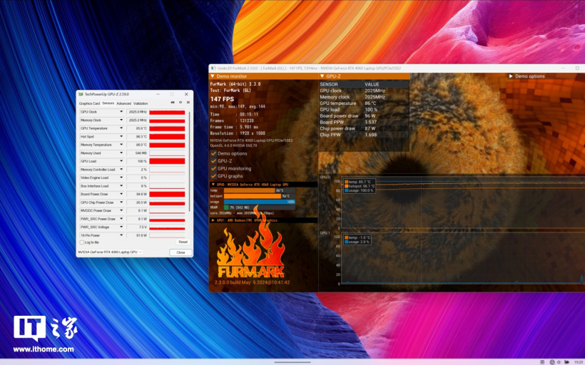 接着单烤 15 分钟的 GPU,此时 GPU 功耗在 95W 上下,GPU 温度为 86 度,显存温度 82 度,GPU 核心频率保持在 2025MHz 左右。