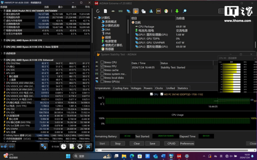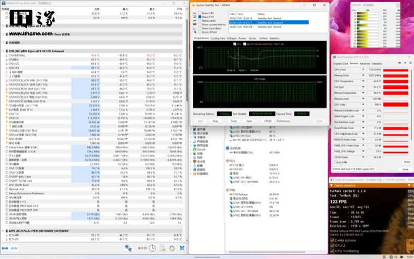 最后是双烤测试,烤机 15 分钟后,CPU 功耗为 46.49W,CPU 温度 93.8 度,CPU 大核频率为 2.3GHz;GPU 方面,GPU 功耗有 71W,GPU 温度为 84.9 度,GPU 频率 1725MHz,整机性能释放可达 117W 左右,对于 ProArt 创 13 2024 的小身板来说还是挺让人意外的。