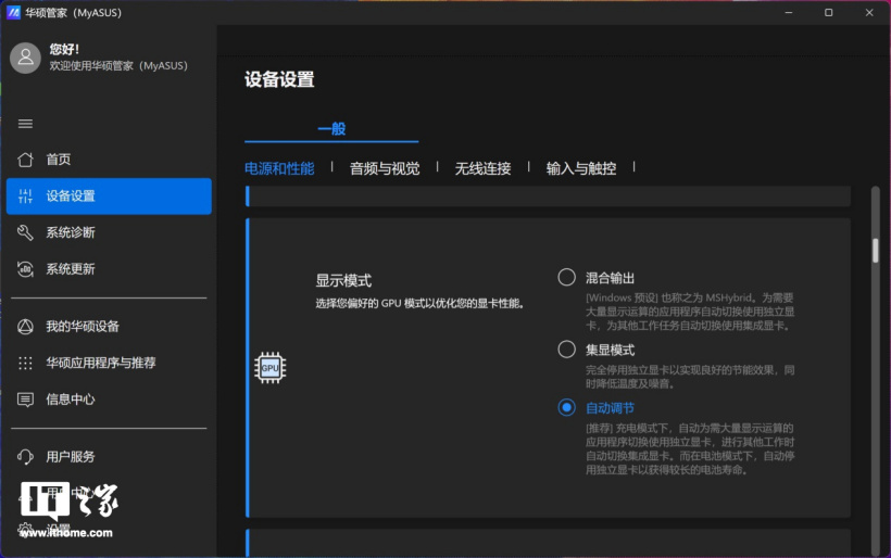 而在显卡输出模式上,则提供了混合输出,集显输出和自动调节三种,测试环节我们均采用高效模式 + 手动模式(各项参数拉至最高)设置作为基准环境。