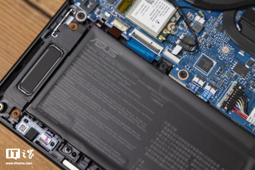 ProArt 创 13 2024 最下面还有一块 73Wh 的大电池,本站通过本地视频播放对它的续航进行了实测。在初始电量 100% 情况下,选择安静模式 + 集显输出,70% 屏幕亮度 + 50% 外放音量,使用 Windows 自带播放器播放 1080P 电影 1 小时,电量下降至 96%,耗电仅为 4%。对于 13 英寸的高性能创作本来说,这样的续航表现已经很出色了。