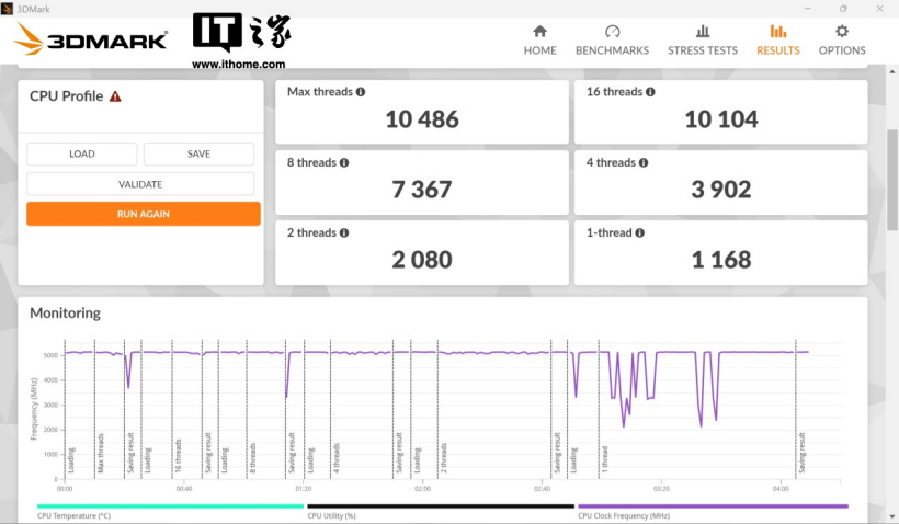 在 3DMark 的 CPU Profile 测试项目中,单线程分数 1168 分,最大线程分数 10486 分。
