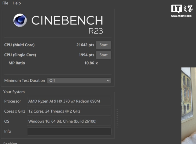 下面进入理论测试环节,在 CineBench R23 的测试中,AMD Ryzen AI 9 HX 370 处理器跑出了单核 1994 分,多核 21642 分的成绩,相比上一代 8945HS 处理器的多核成绩(17339 分)有较大提升,单核跑分方面较之两者也有 200 分左右的优势,性能提升幅度较大。