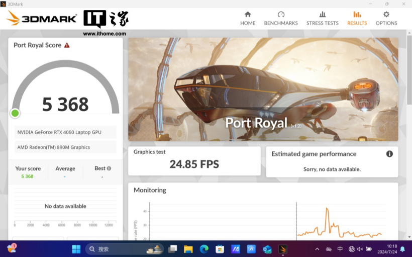 在 3DMark 的 Port Royal 光追测试中,RTX 4060 综合分数为 5368 分。
