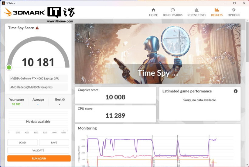 显卡方面,在 3DMark 的 Time Spy 测试中,CPU 物理分数 11289 分,RTX 4060 的显卡分数则是突破了 10000 分。