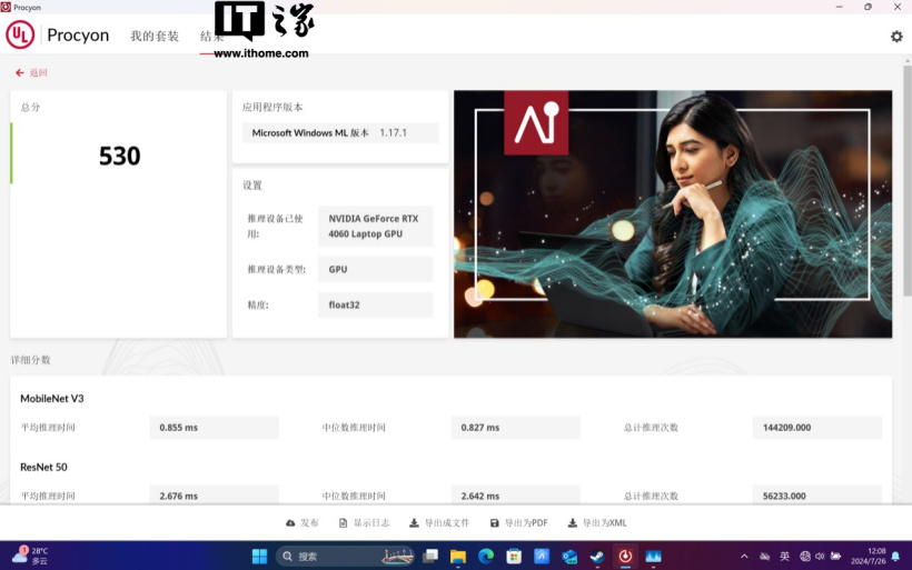 若是使用 RXT 4060 进行测试,则是可以拿到 530 分的成绩,各项数据相对于核显来说都有极大提升,可满足在端侧使用大模型进行文生图创作的需求。