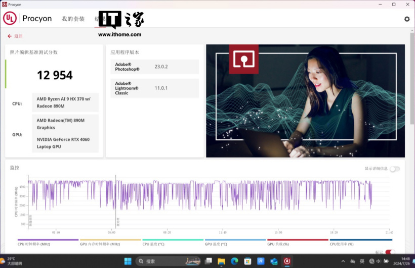照片与视频的编辑测试我们同样使用 UL Procyon 进行测试。照片测试主要考察照片编辑工作流中最常用的 Adobe Lightroom 与 PhotoShop 两款软件的性能。包含套用预设,对照片机型裁切、拉直、修改编辑多图层效果等操作,ProArt 创 13 2024 最终收获 12954 分,足以胜任专业的摄影照片编辑工作。