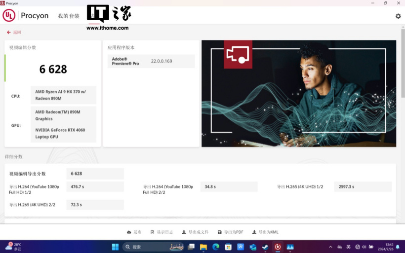 视频创作方面,UL Procyon 主要考察 Premiere Pro 的剪辑流畅程度,包括时间线上内容的剪辑、调整和效果,以及 GPU 的渲染预览、视频文件的编解码等,ProArt 创 13 2024 最终得分 6628,对于 H265 视频的编码也比较快。
