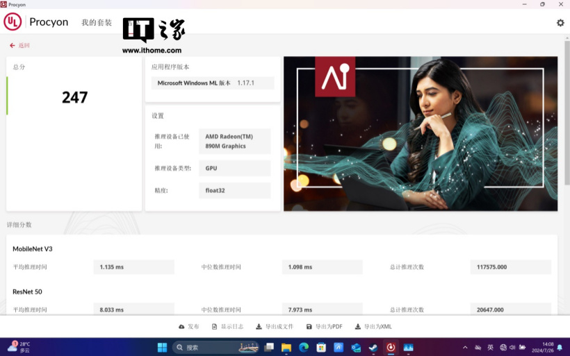 若是使用 890M 核心显卡进行测试,则可以拿到 247 分。以第一个项目 MobileNet V3 为例,单次推演时间快了 0.4ms,单位时间内的推演次数有着极大提升。