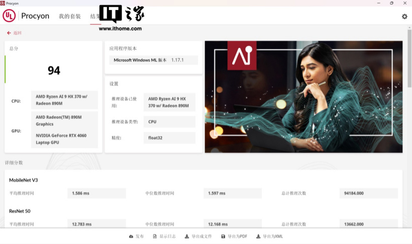 AI 性能方面,本站使用 UL Procyon 进行测试,这款软件的 AI 部分主要是基于 Windows ML 的 API 以考察 AI 的推理性能,搭载锐龙 AI 9 HX 370 的华硕 ProArt 创 13 2024 拿到了 94 分的 CPU 成绩。这个成绩显然是没有调用新一代锐龙 AI 9 370 的 NPU。