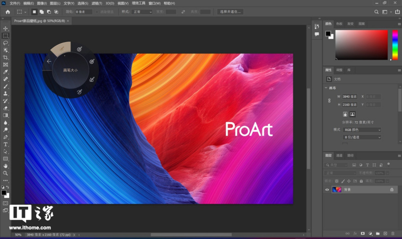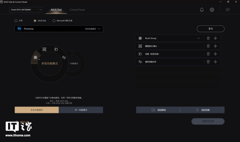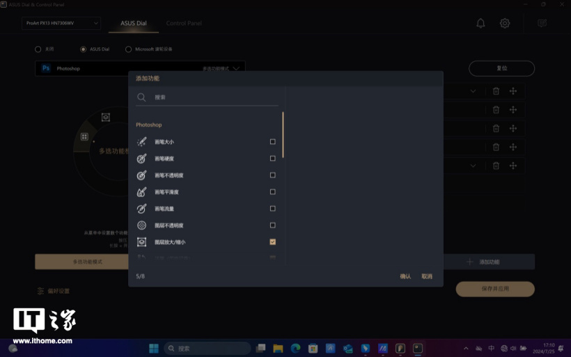 使用不同的生产力软件时,华硕虚拟旋钮所适配的功能也会跟着变化,例如在 PhotoShop 中,华硕就为用户提供了丰富的快捷调节选项,例如常用的画笔大小、图层不透明度等等。