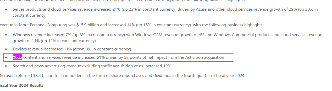 5、从去年10月收购完成动视暴雪后,微软开始使用名为“收购动视暴雪的净影响”的新指标,此次收购对微软Q4游戏总收入的净影响为48个百分点——也就是说,如果没有动视暴雪,Q4游戏总收入将同比下降4%(而不是增长44%)。