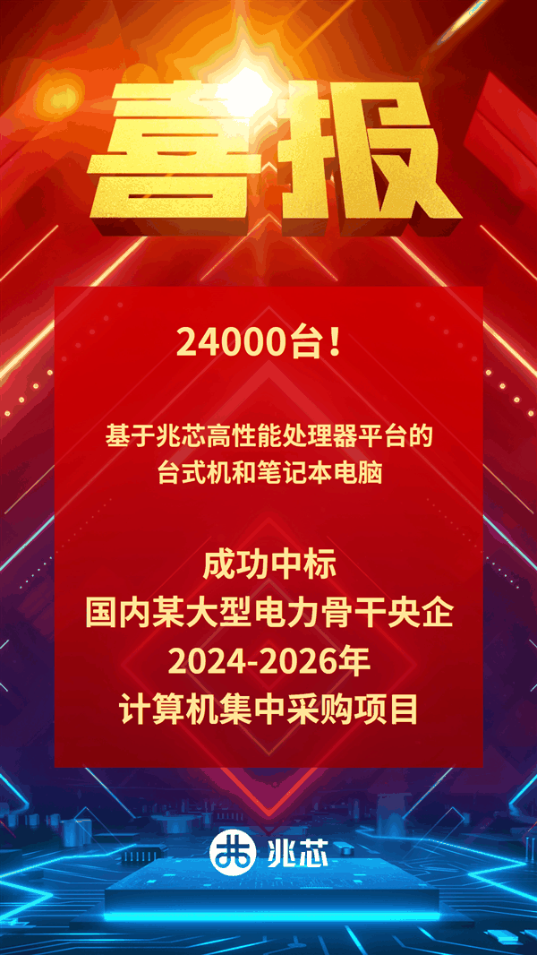 另外,兆芯日前宣布,在国内某大型电力骨干央企2024-2026年计算机集中采购项目中,2.4万台基于兆芯处理器平台的台式机、笔记本电脑成功中标。