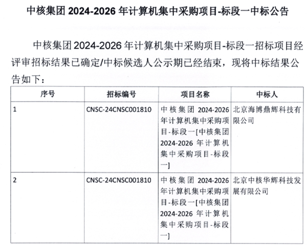 龙芯未公布具体是哪家央企,但就在近日,中核集团(中国核工业集团有限公司)公布了2024-2026年计算机集中采购项目中标结果公告,正好就是5个标段。