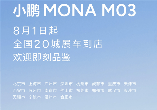 而小鹏的第二品牌MONA,首款车型M03,也于今日登录全国20 大城市门店,覆盖北京、上海、广州、深圳、杭州、成都、重庆、天津等。