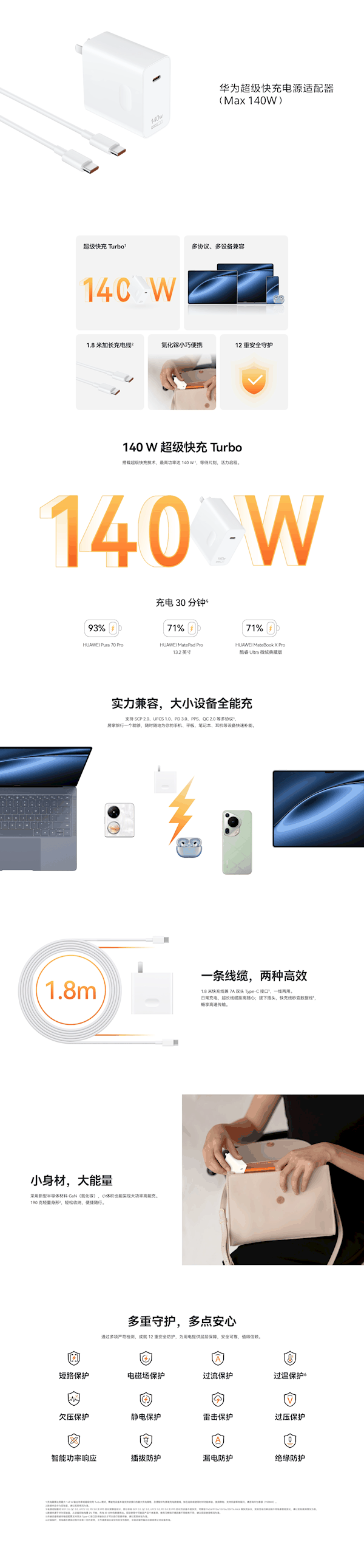 充电头搭载超级快充技术,最高功率达140W,宣称30分钟内可将华为Pura 70 Pro充至93%、华为MatePad Pro 13.2充至71%、华为MateBook X Pro充至71%。