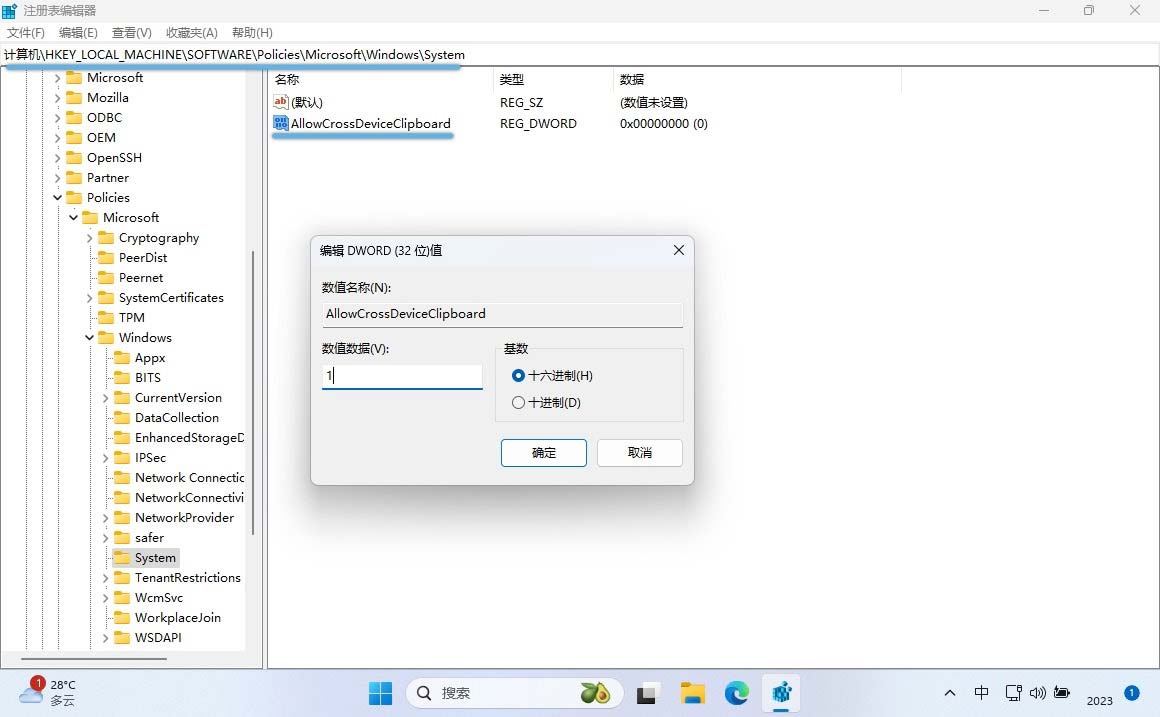 3、新建一个名为 AllowCrossDeviceClipboard 的 DWORD(32 位)值,并将其十六进制值设置为 1。