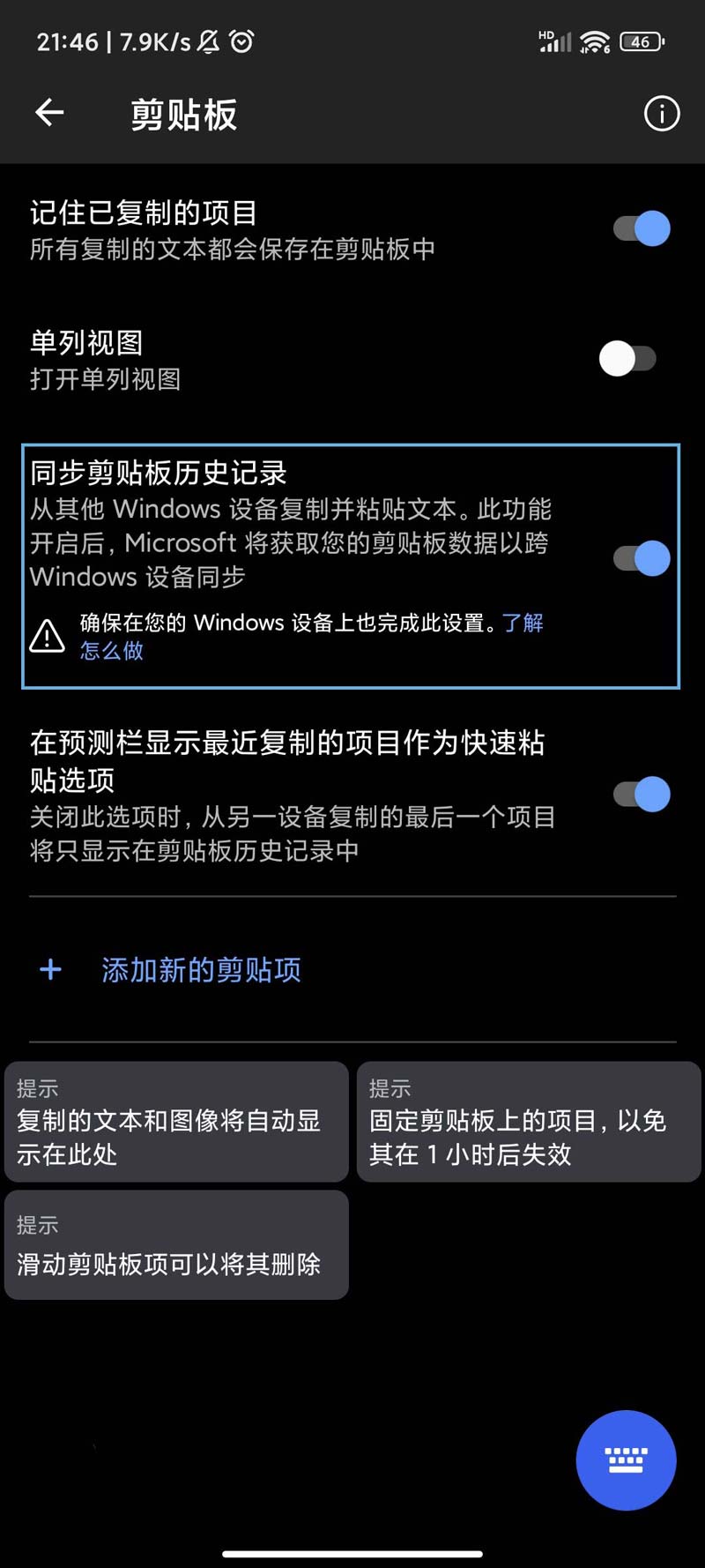 - 「在设备之间进行同步」开关用于控制是否通过云端同步剪贴板历史记录。