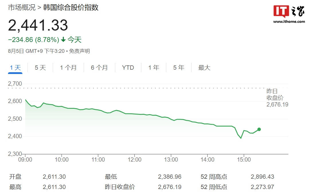 本站 8 月 5 日消息,韩联社报道称,受美国经济指标恶化的不利影响,韩国综合股价指数(kospi、由所有在韩国交易所内交易的股票价格来计算)5 日盘中跌破 2500 点。在 kospi 上市的股票中,98% 的股票出现下跌。截至本站发文,韩国综合股价指数(kospi)为 2441.33,跌幅为 8.78%。