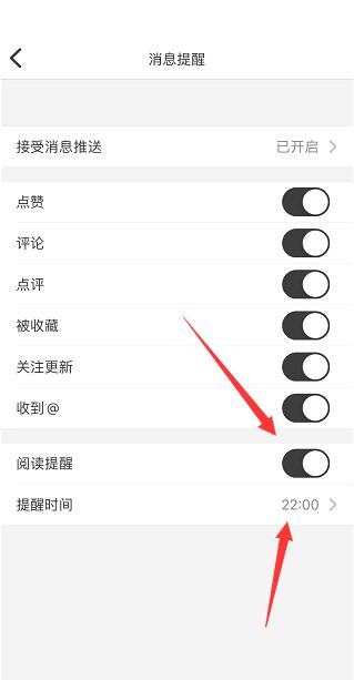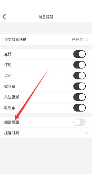 3、接着开启阅读提醒右侧开关。
