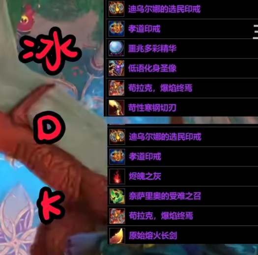 还有另一套推荐:迪乌尔娜的选民印戒、孝道印戒、烬魄之灰、奈萨里奥的受难之召、苟拉克,爆焰终焉、原始熔火长剑。这一套装备能够让冰 DK