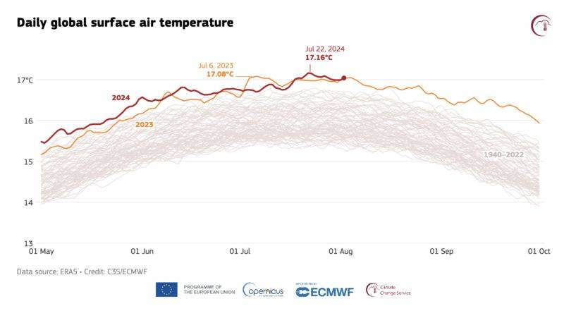 尽管这一趋势在2024年7月有所中断,但该月仍然经历了极其炎热的天气,其中包括了全球最热的三天:7月21日(17.09摄氏度)、7月22日(17.16摄氏度)以及7月23日(17.15摄氏度)。