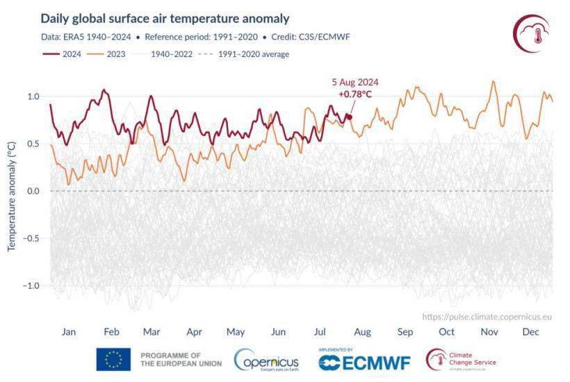【itbear】8月10日消息,近期,根据欧洲哥白尼系统的数据显示,2024年7月的全球平均气温略微低于2023年同期,这一变化标志着持续13个月的破纪录高温状态宣告结束。