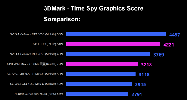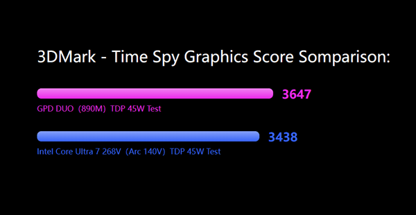 GPD在产品介绍中称,Radeon 890M核显搭配LPDDR5X-7500内存,45W功耗释放下,3DMark Time Spy图形得分为3647。