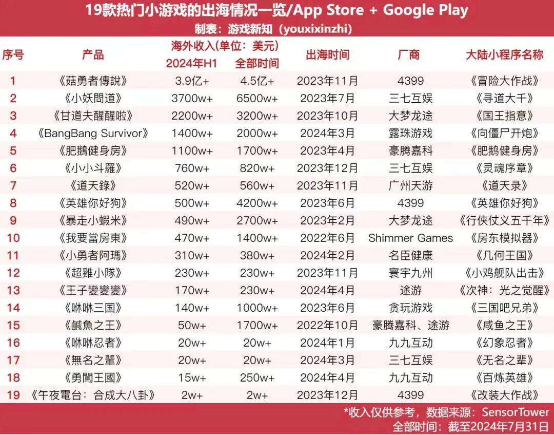 在小游戏海外收入最高,之前我一直以为是三七互娱,原来是4399啊。